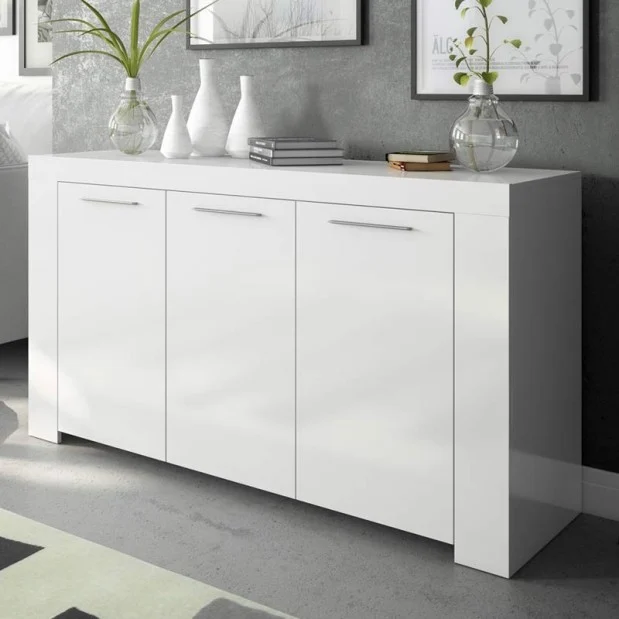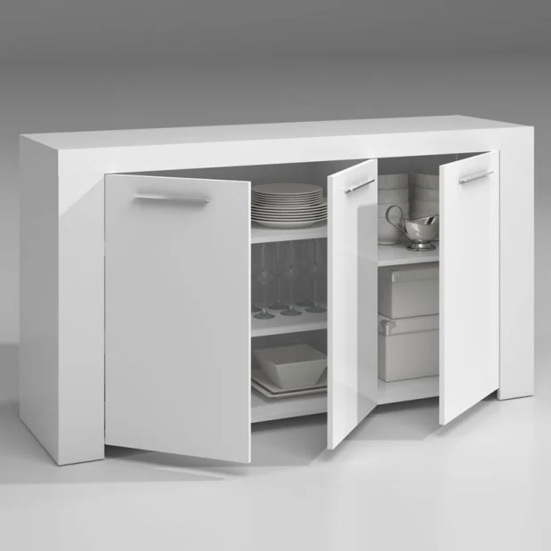 Cuenta con 2 módulos de almacenaje, uno de ellos doble, con 2 baldas interiores fijas y 2 puertas, y un módulo lateral con una balda interior fija y una puerta. Las puertas incluyen acabados de calidad, con tiradores y bisagras metálicos. El mueble se completa con una trasera y una superficie útil que puedes decorar con los accesorios que más te gusten.