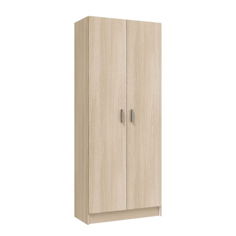 Gracias a sus dos puertas batientes, el armario ofrece un acceso cómodo y amplio a su interior. En su distribución interna, se combina una zona de almacenamiento con baldas regulables en altura y un espacio vertical diseñado para guardar objetos de mayor tamaño, como escobas, aspiradoras o cualquier utensilio de limpieza. Esto lo convierte en un mueble versátil, ideal tanto para ropa como para productos de hogar.