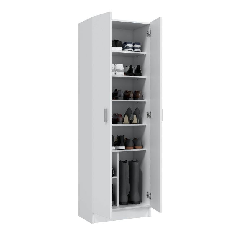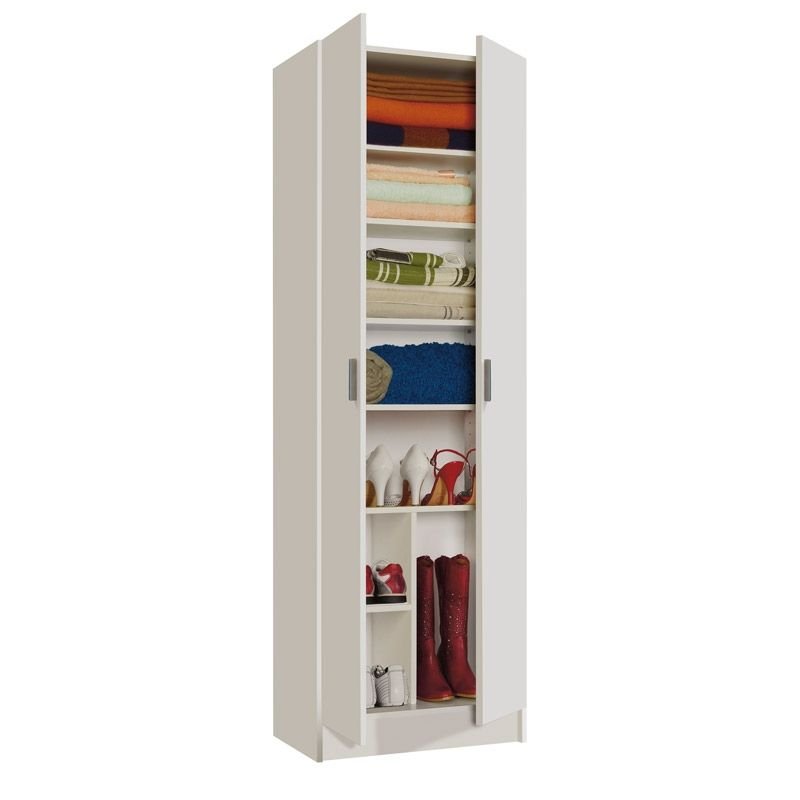 Su diseño compacto con dos puertas batientes con tiradores en ABS y estantes ajustables ofrece una distribución interior versátil, permitiendo organizar ropa, accesorios, documentos o productos de limpieza de manera eficiente.