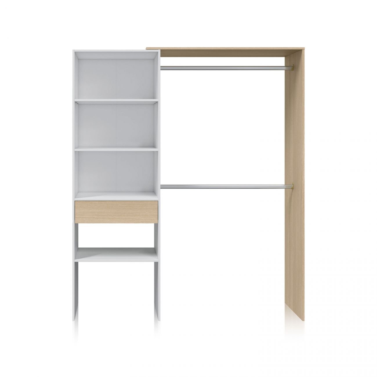 El Armario vestidor Mural es un armario muy completo al combinar una parte de barras para perchas con dos alturas y una parte lateral con un cajón cerrado para guardar aquello que no queramos que esté a la vista y estanterías abiertas perfectas para colocar camisetas o pantalones.