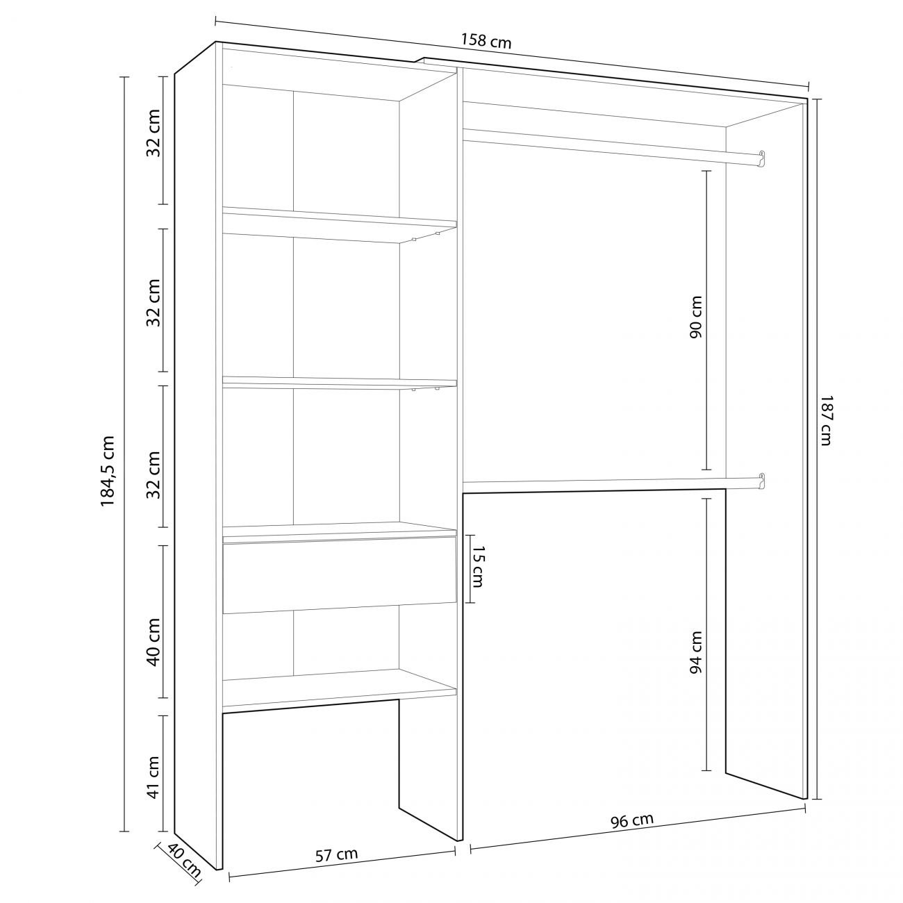 Dos de los estantes laterales son regulables en altura por lo que es perfecto en el caso de que queramos más espacio, además podemos montar el armario del lado que queramos al tener dos opciones de colocación. ¿Qué mas se puede pedir?