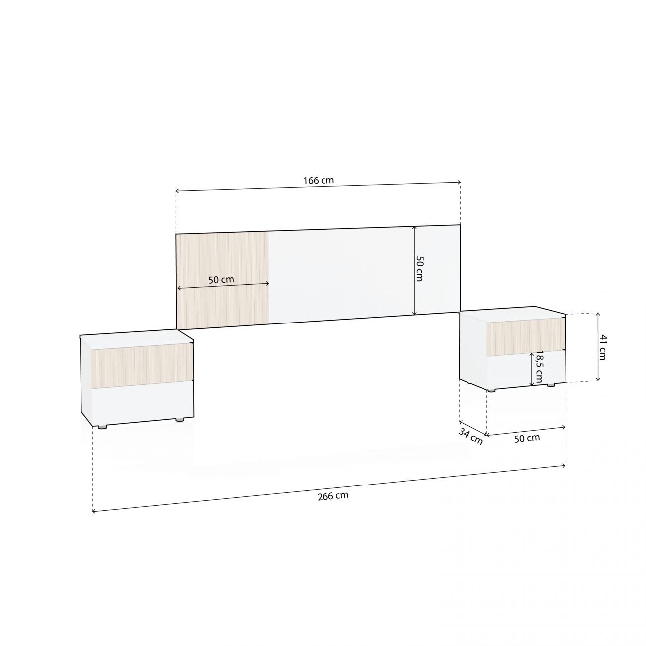 El cabecero, con una longitud total de 166 cm, puede montarse en dos orientaciones diferentes, lo que brinda la libertad de elegir el lado de la cama donde se orienta la parte en color Natur.