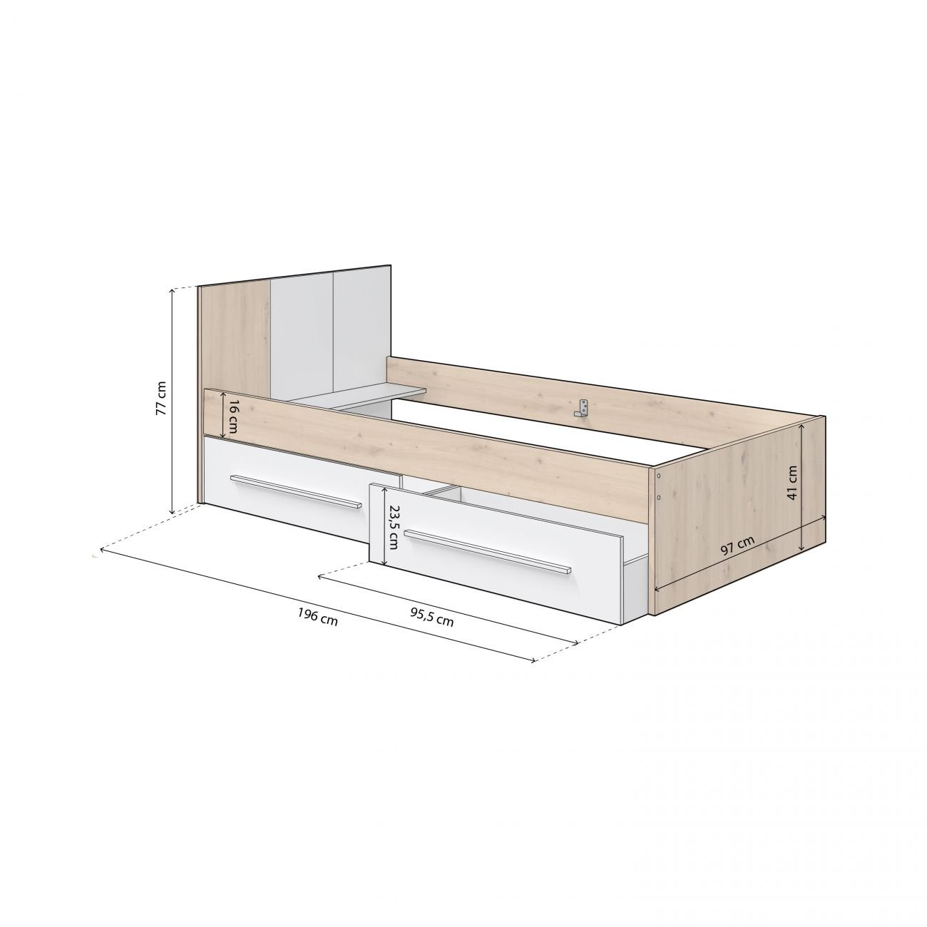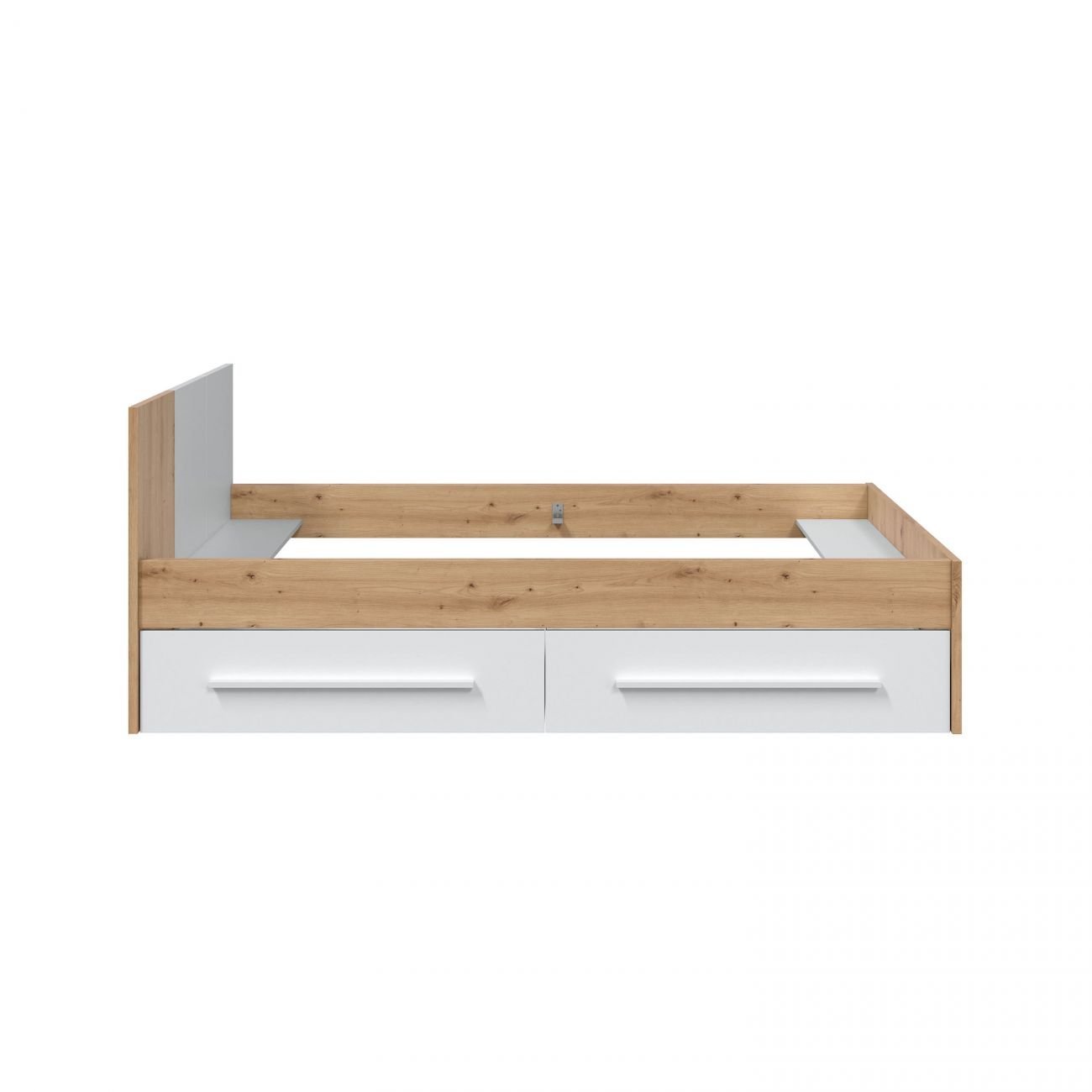 En su parte inferior incorpora dos amplios cajones deslizantes, perfectos para el almacenamiento diario. Gracias a su tamaño y profundidad, permiten guardar ropa de cama, prendas de vestir, juguetes o cualquier otro elemento que desees mantener ordenado y al alcance. Los cajones están equipados con tiradores largos y ergonómicos, diseñados para una apertura cómoda y sin esfuerzo, aportando además un toque visual distintivo.