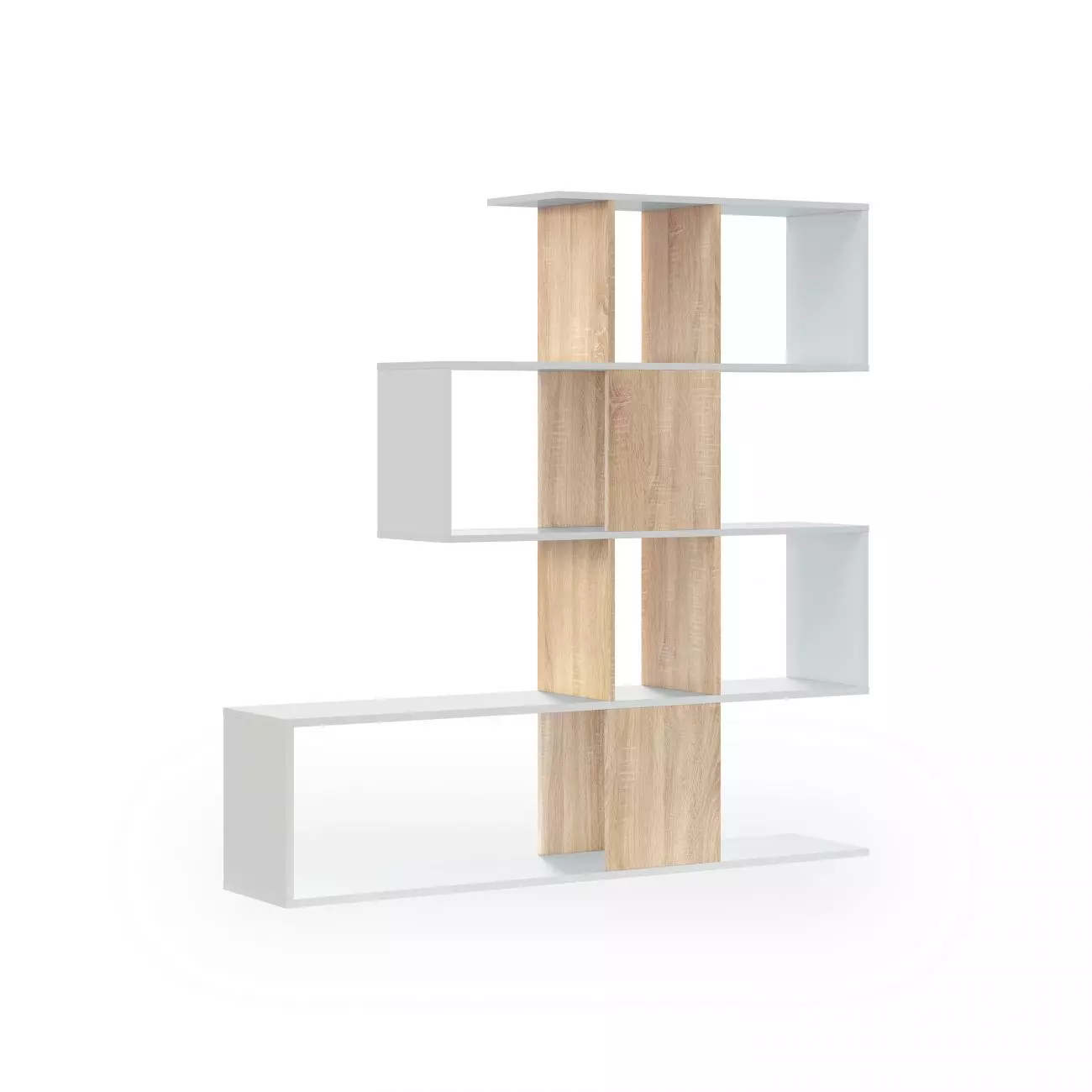 Los paneles verticales aportan estabilidad al conjunto y actúan como divisores visuales, añadiendo profundidad al diseño sin recargar el ambiente. Las líneas rectas y los cantos definidos refuerzan su estética contemporánea, mientras que la disposición asimétrica de los estantes genera un ritmo visual atractivo y actual.
