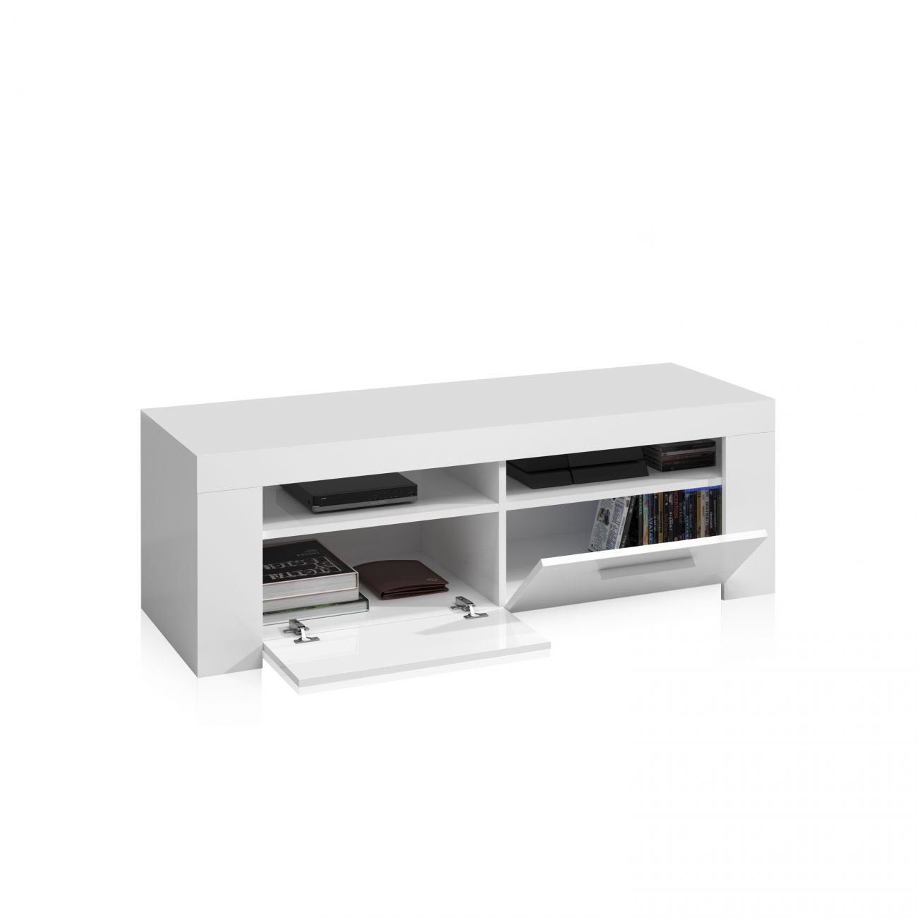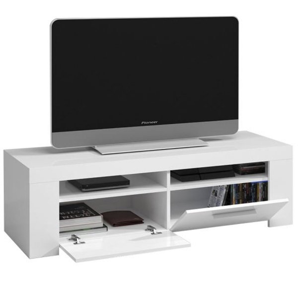 En la parte superior del mueble se encuentran dos estantes abiertos, ideales para colocar equipos electrónicos como reproductores multimedia, consolas o altavoces. Esta disposición permite una ventilación adecuada de los dispositivos y un fácil acceso a los cables. Todo ello, sobre una superficie sólida que sirve de base perfecta para una pantalla de televisión.