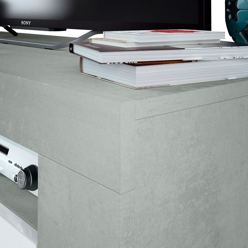 En la parte superior del mueble se encuentran dos estantes abiertos, ideales para colocar equipos electrónicos como reproductores multimedia, consolas o altavoces. Esta disposición permite una ventilación adecuada de los dispositivos y un fácil acceso a los cables. Todo ello, sobre una superficie sólida que sirve de base perfecta para una pantalla de televisión.