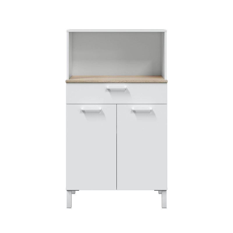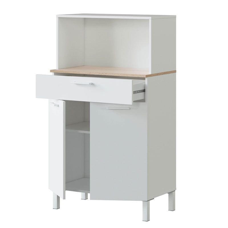 Este mueble se compone de una estructura inferior con dos puertas que ocultan un amplio compartimento con estante interior, ideal para guardar utensilios de cocina, vajilla o productos de despensa. Sobre esta sección, una práctica encimera ofrece espacio adicional de trabajo o apoyo, perfecta para pequeños electrodomésticos, preparación de alimentos o elementos decorativos. Encima de la encimera se encuentra una balda abierta que añade funcionalidad y accesibilidad para tener a mano los elementos de uso diario o decoraciones ligeras.