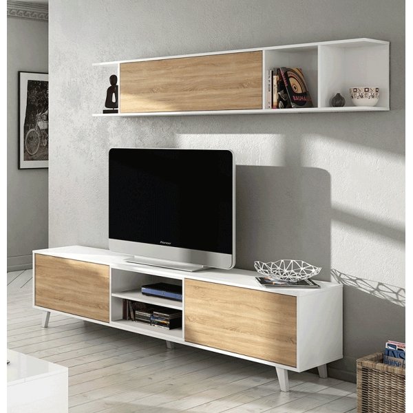 Está formado por un mueble bajo para televisión y un módulo superior suspendido. El mueble inferior cuenta con dos amplias puertas a los lados, donde es posible guardar objetos como cables, mandos, juegos o pequeños dispositivos electrónicos. En el centro, incorpora dos estantes abiertos ideales para colocar el router, consolas o reproductores, todo perfectamente accesible y bien organizado.
