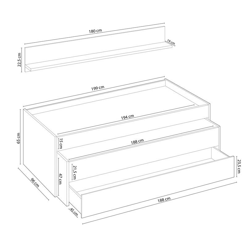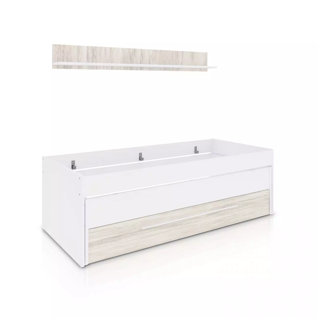Como complemento, el conjunto incluye un estante elevado de pared, ideal para colocar libros, objetos decorativos o accesorios personales. Esta balda funcional permite tener al alcance los elementos esenciales sin ocupar espacio extra en la habitación.