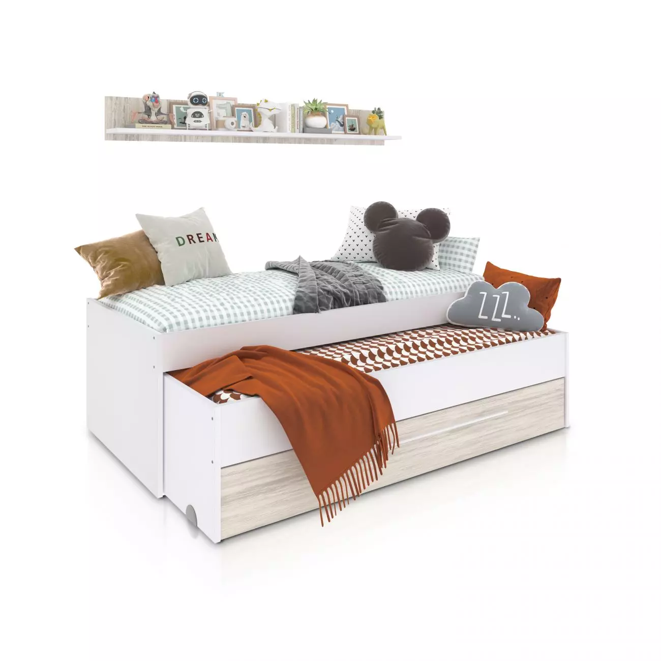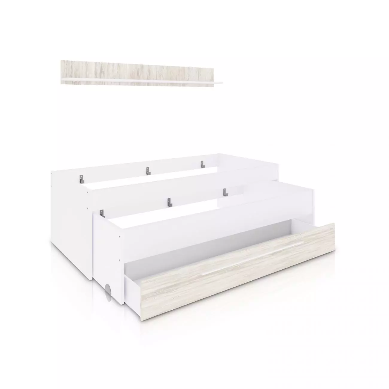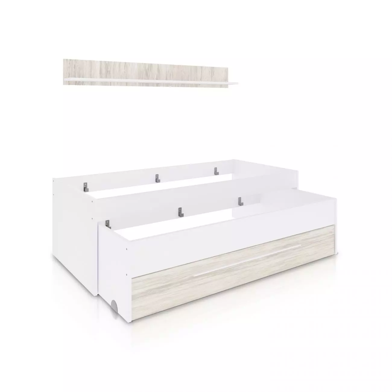 El sistema de cama nido permite desplegar fácilmente la segunda cama cuando se necesite, ofreciendo una solución práctica para visitas o para familias con hermanos que comparten habitación. Además, la cama inferior incorpora un cajón de almacenamiento amplio, perfecto para guardar ropa de cama, juguetes o cualquier otro objeto, ayudando a mantener el orden en el dormitorio.