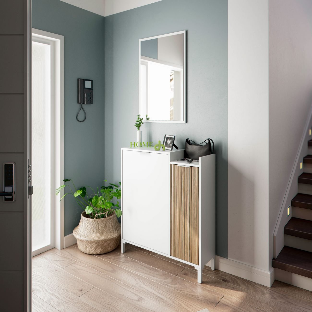 El módulo en casi toda su totalidad es en color blanco artik y la puerta derecha en color natur para darle ese toque que marcará la diferencia en tu recibidor. El mueble incluye también un espejo con marco en color blanco artik para la pared que lleva los herrajes de fijación incluidos.