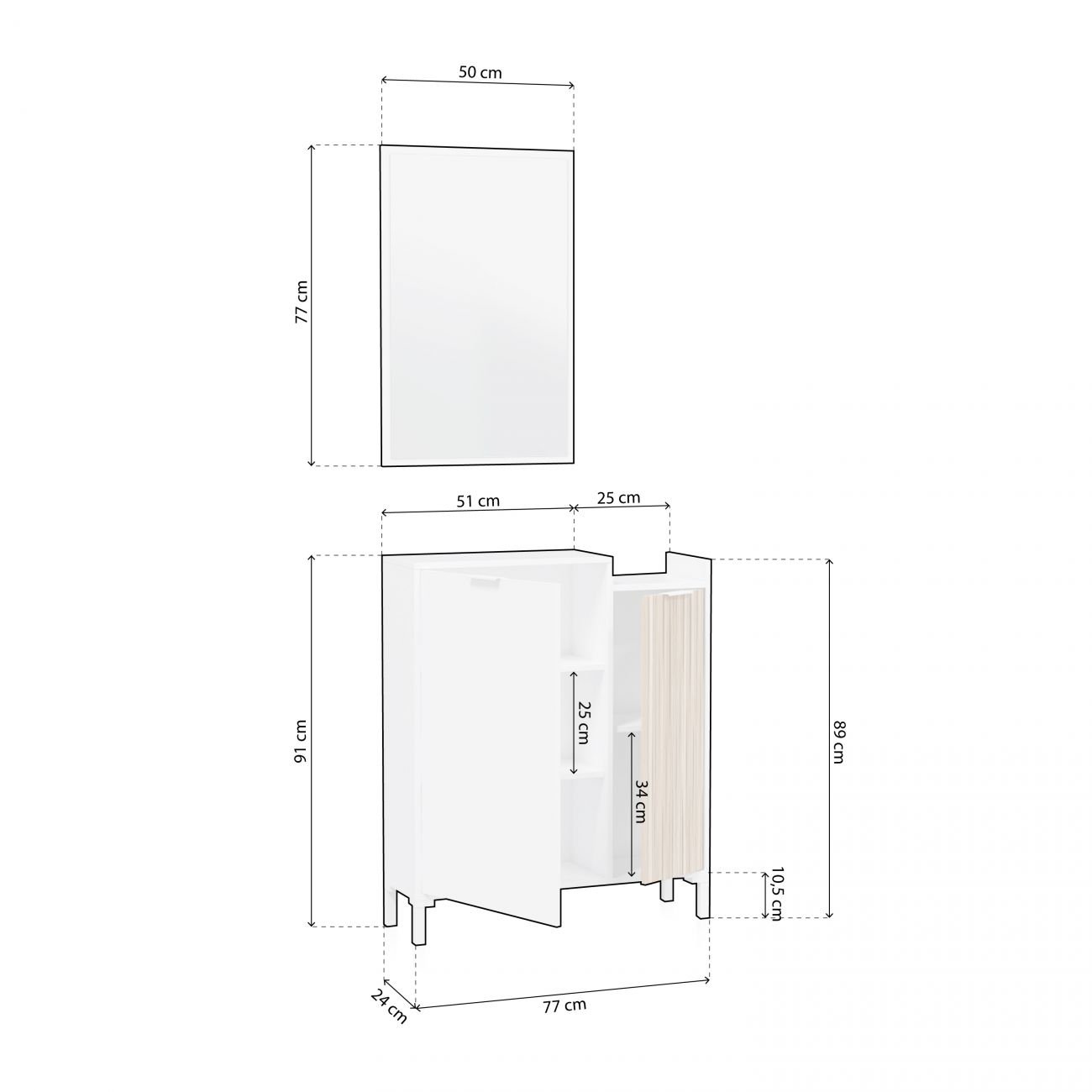 Este mueble consta de un módulo con un cajón no extraíble con 5 espacios de almacenaje (3 en la puerta izquierda y 2 en la puerta derecha) y un espejo que lo puedes orientar tanto vertical como horizontal