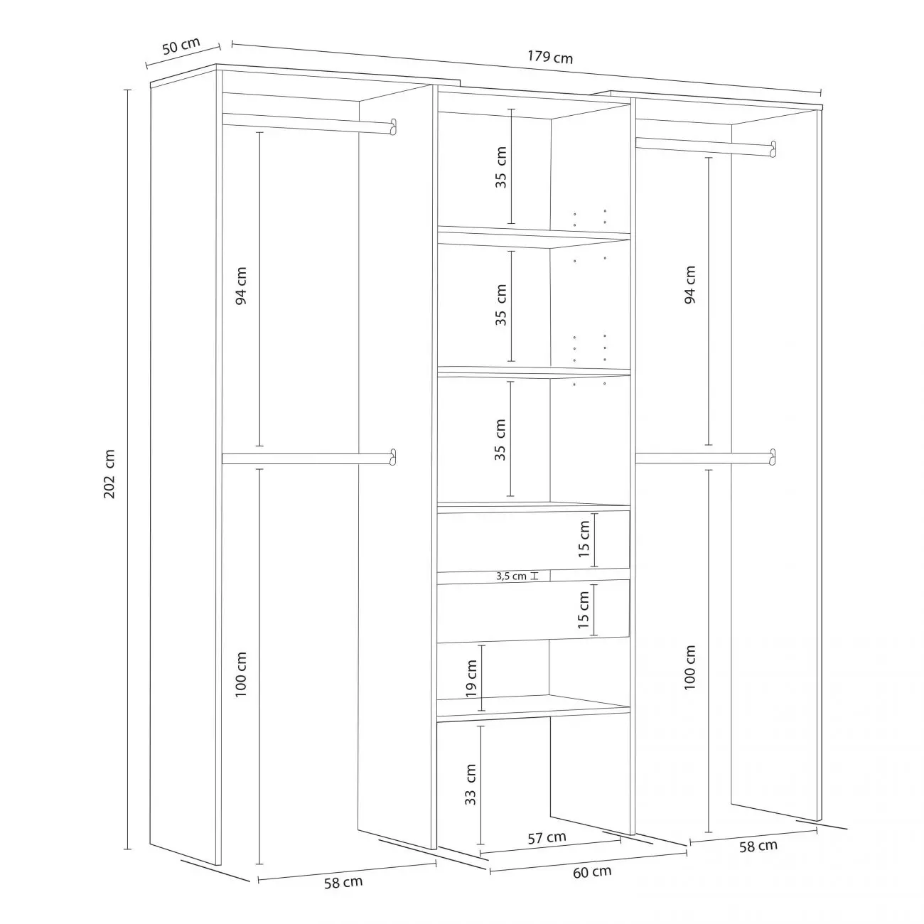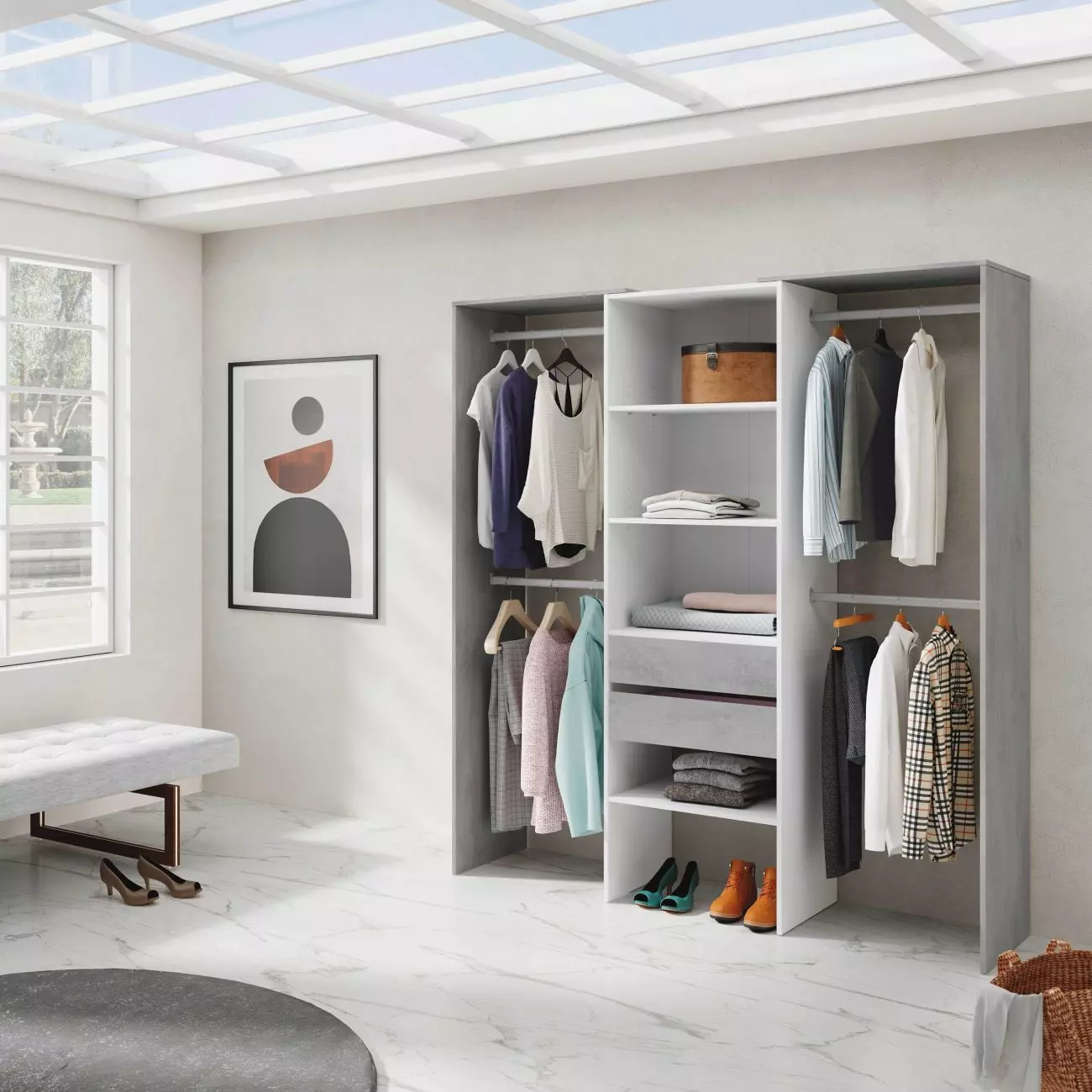 Este armario se compone por 4 barras de aluminio extraíbles, dos a cada lateral, y un espacio central con 4 estantes, dos de ellos regulables en altura con un peso máximo soportado de 8kg cada uno y 2 cajones con un peso máximo soportado de 5kg cada uno, además puedes utilizar la parte superior del armario guardando aquello que menos utilizas en cajas decorativas, además cuenta con tacos ABS quitaruidos y antirayadas.