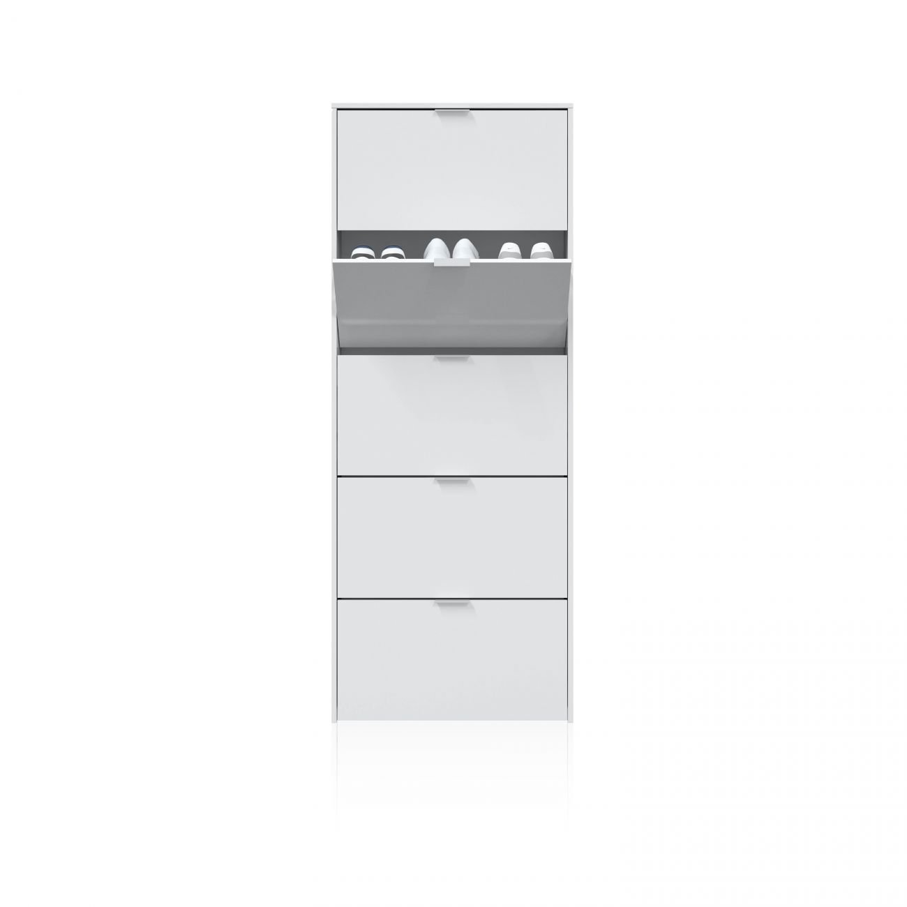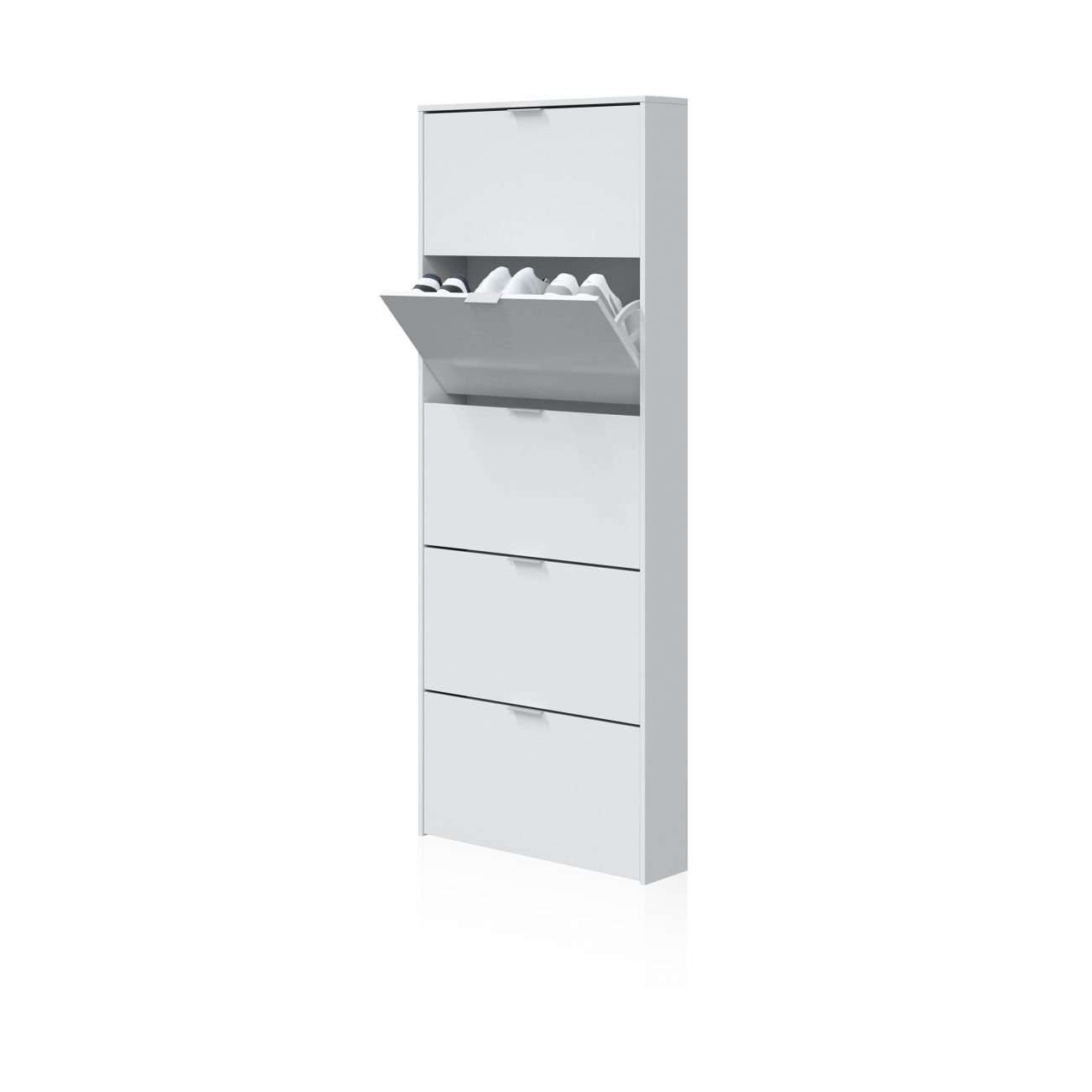 Cada uno de los cinco compartimentos está equipado con una puerta abatible tipo trampilla, que se abre de forma práctica hacia el frente. Estos módulos permiten guardar varios pares de zapatos por nivel, ofreciendo una solución funcional y accesible para mantener el calzado en orden y fuera de la vista.